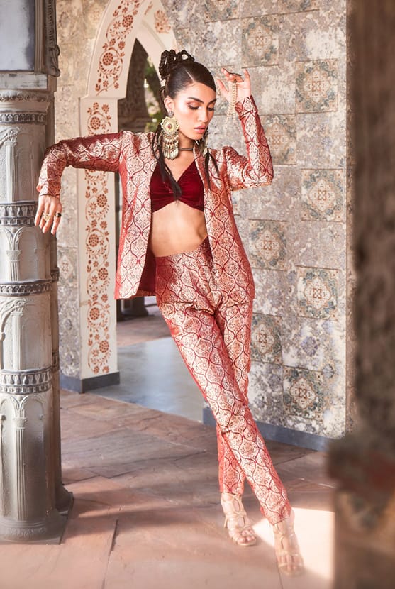 Be the first to review “Pure velvet bustier paired with brocade jacket and pants.”